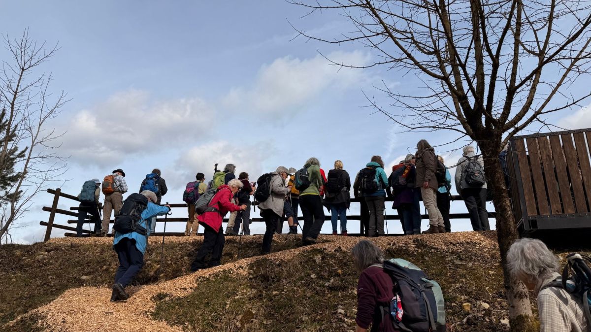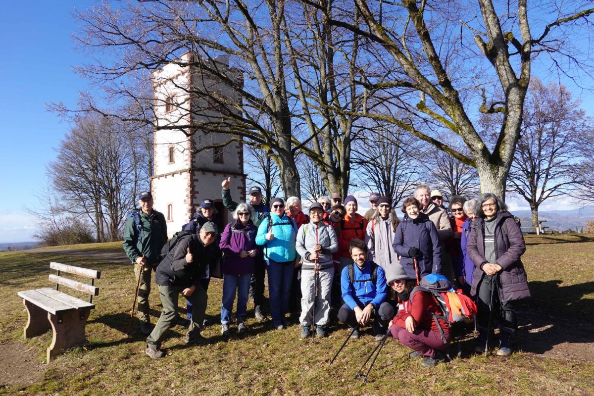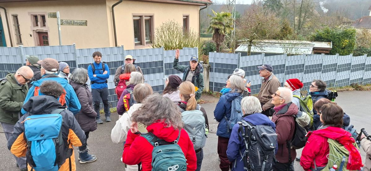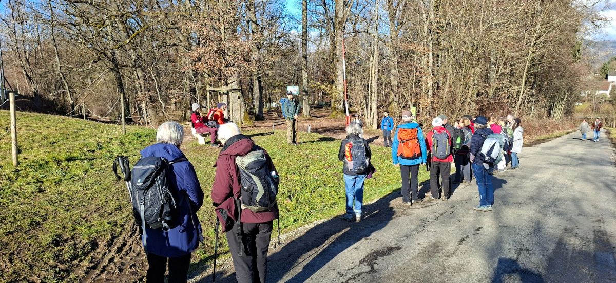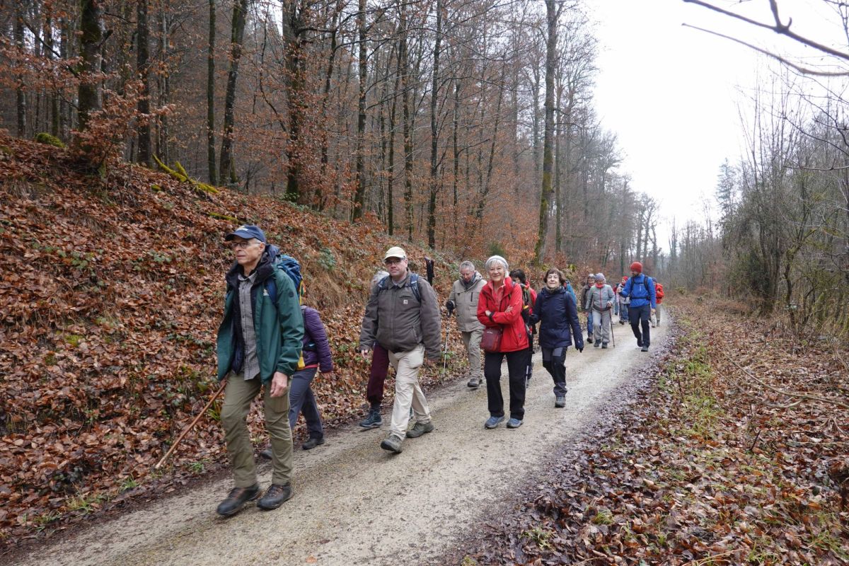 Unten kühl, grau und in den Waldpartien feucht und morastig, oben hingegen blau, sonnig und fast frühlingshaft, so präsentierte sich das Wetter auf der Wanderung zum Dinkelberg. Aufgrund einer leicht geänderten Route und anhaltender Forstarbeiten waren viele Waldwege stark aufgeweicht, was der guten Stimmung der 30 Teilnehmenden jedoch keinen Abbruch tat. Die Route führte am Schloss Beuggen vorbei, dem Rhein entlang nach Riedmatt und von dort auf Waldwegen hinauf auf die Höhen des Dinkelbergs. Die sonst trockene Karstlandschaft zeigte sich nach starken Regenfällen ungewohnt nass, Dolinen waren dennoch erkennbar. Das Teufelsloch konnte wegen Forstarbeiten nicht besucht werden. Nach einer Rast ging es über eine Umleitung ins offene Gelände Richtung Hohe Flum, wo die Mittagsrast mit Feuer, Verpflegung, Turmbesteigung und Aussicht verbracht wurde. Beim Abstieg ins Wiesental öffneten sich Ausblicke auf Zeller Blauen und Hohe Möhr.Im Sengelenwäldchen bei Schopfheim besuchte die Gruppe den Pavillon mit der Büste von Johann Peter Hebel. Gegen 15 Uhr erreichten wir den Bahnhof Schopfheim; einige reisten direkt zurück, andere kehrten noch in einer Konditorei ein.
