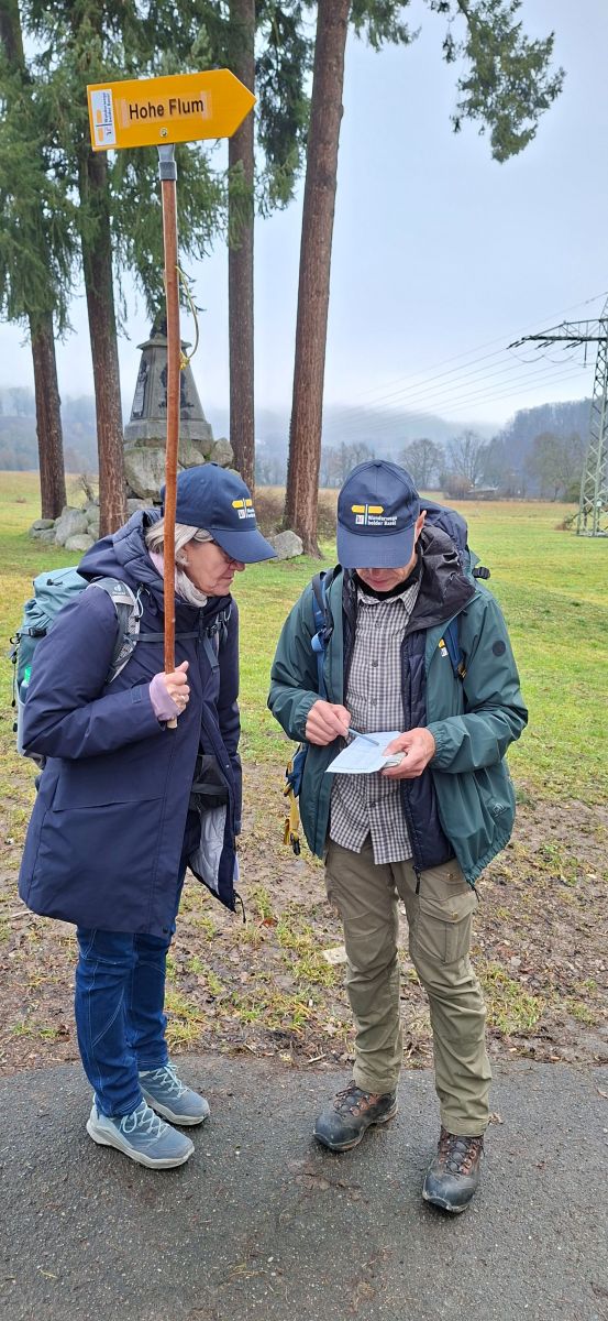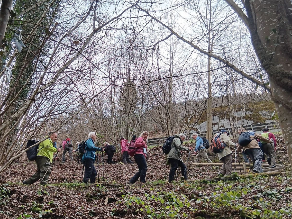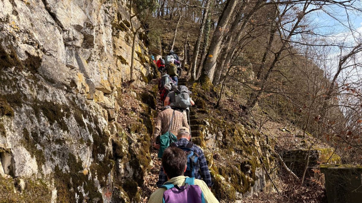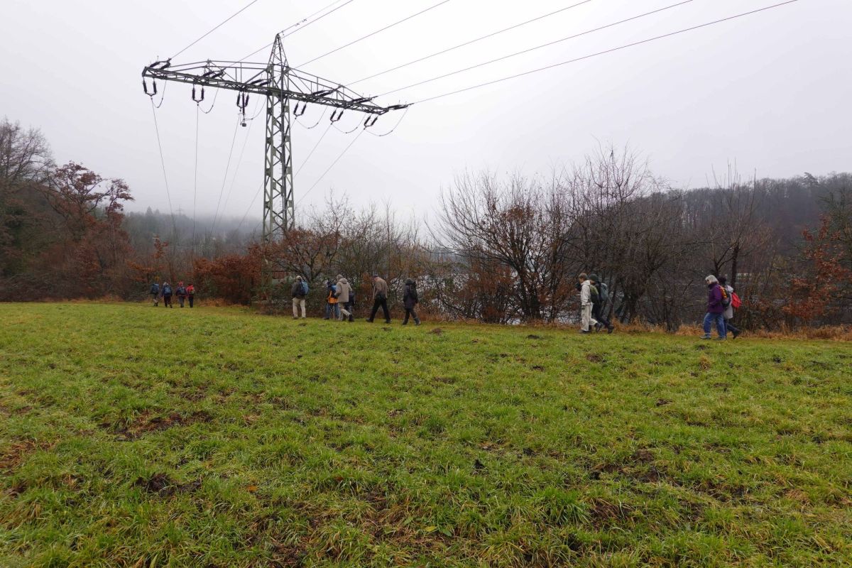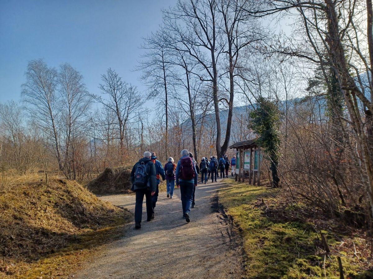 Unten kühl, grau und in den Waldpartien feucht und morastig, oben hingegen blau, sonnig und fast frühlingshaft, so präsentierte sich das Wetter auf der Wanderung zum Dinkelberg. Aufgrund einer leicht geänderten Route und anhaltender Forstarbeiten waren viele Waldwege stark aufgeweicht, was der guten Stimmung der 30 Teilnehmenden jedoch keinen Abbruch tat. Die Route führte am Schloss Beuggen vorbei, dem Rhein entlang nach Riedmatt und von dort auf Waldwegen hinauf auf die Höhen des Dinkelbergs. Die sonst trockene Karstlandschaft zeigte sich nach starken Regenfällen ungewohnt nass, Dolinen waren dennoch erkennbar. Das Teufelsloch konnte wegen Forstarbeiten nicht besucht werden. Nach einer Rast ging es über eine Umleitung ins offene Gelände Richtung Hohe Flum, wo die Mittagsrast mit Feuer, Verpflegung, Turmbesteigung und Aussicht verbracht wurde. Beim Abstieg ins Wiesental öffneten sich Ausblicke auf Zeller Blauen und Hohe Möhr.Im Sengelenwäldchen bei Schopfheim besuchte die Gruppe den Pavillon mit der Büste von Johann Peter Hebel. Gegen 15 Uhr erreichten wir den Bahnhof Schopfheim; einige reisten direkt zurück, andere kehrten noch in einer Konditorei ein.
