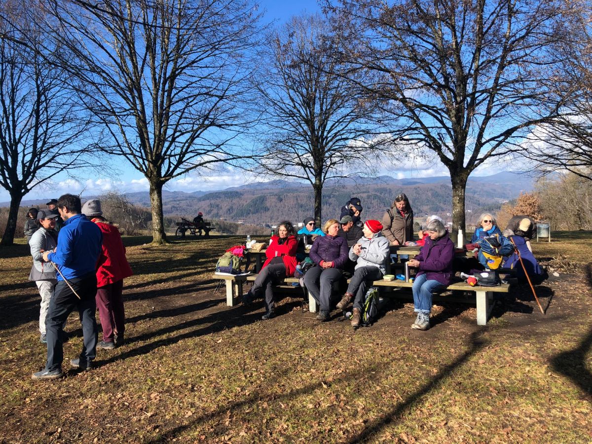 Am ersten Wandertag der Wanderwege beider Basel 2026 fehlten nur Schnee und Sonne. Bei Temperaturen knapp über dem Gefrierpunkt und leichter Bise startete die Gruppe in Riehen Dorf und wanderte zügig über den Linsberg zur Kirche St. Chrischona. Hochnebel verhüllte die Region und die Alpen. Weiter ging es zum Chrischonaturm, ebenfalls im Nebel. Auch in Rührberg blieb es hochneblig, ohne Aussicht auf den Schwarzwald. Der guten Laune der Teilnehmenden tat dies keinen Abbruch; es wurde munter auf Deutsch, Englisch und Schweizer Mundart geplaudert. Auf Waldwegen und etwas querfeldein erreichte die Gruppe den mehrheitlich unbekannten Eigenturm. Schnell wurde ein Feuer entfacht, Hände gewärmt und erste Chlöpfer gebraten. Nach rund 45 Minuten unternahmen wir den teils rutschigen und mit Laub bedeckten Abstieg. Ohne Zwischenfall erreichte man die Busstation Degerfelden Adler und fuhr über Lörrach oder Rheinfelden/D (mit Kaffeehalt bei Heitzmann!) nach Hause.