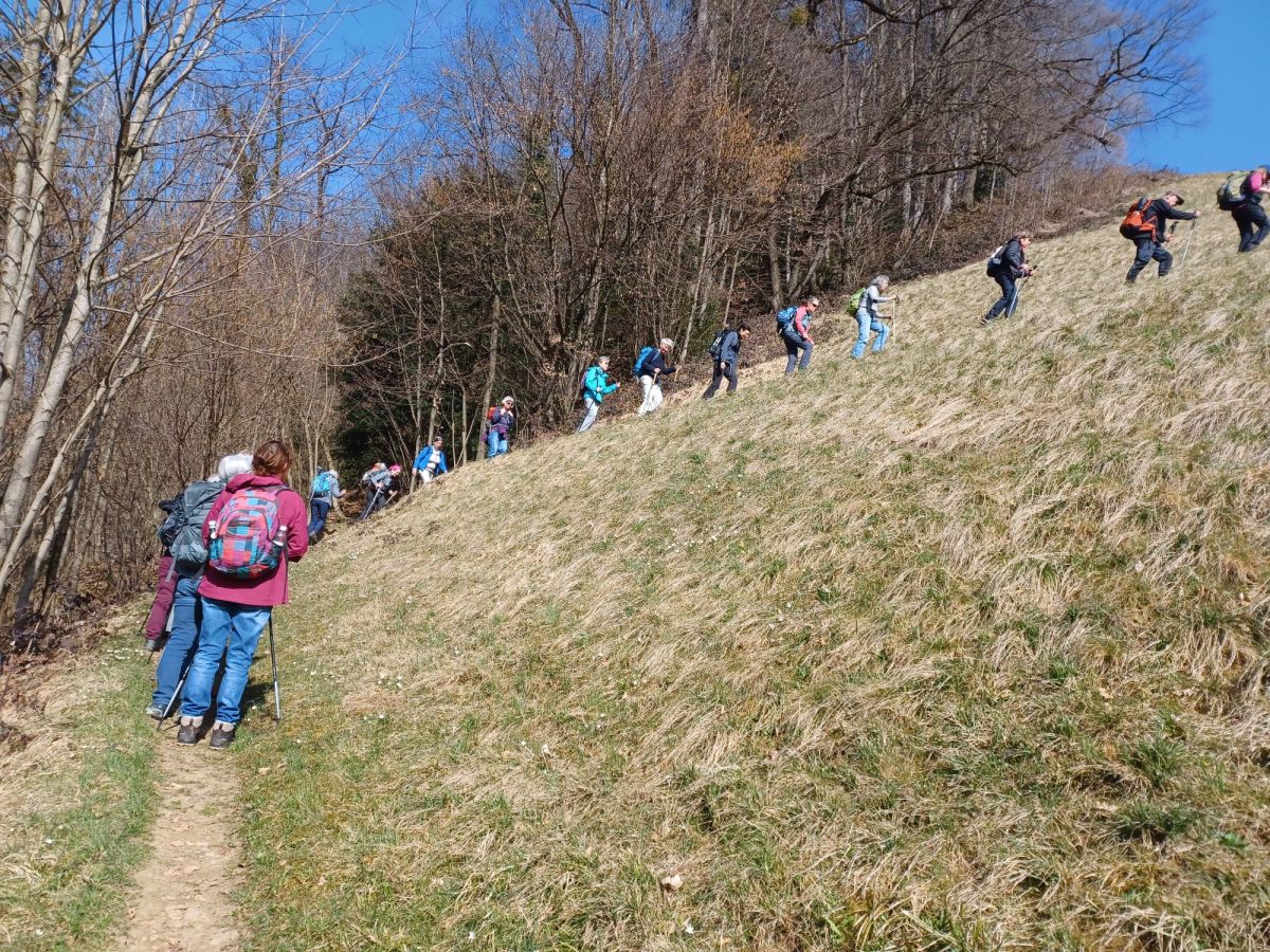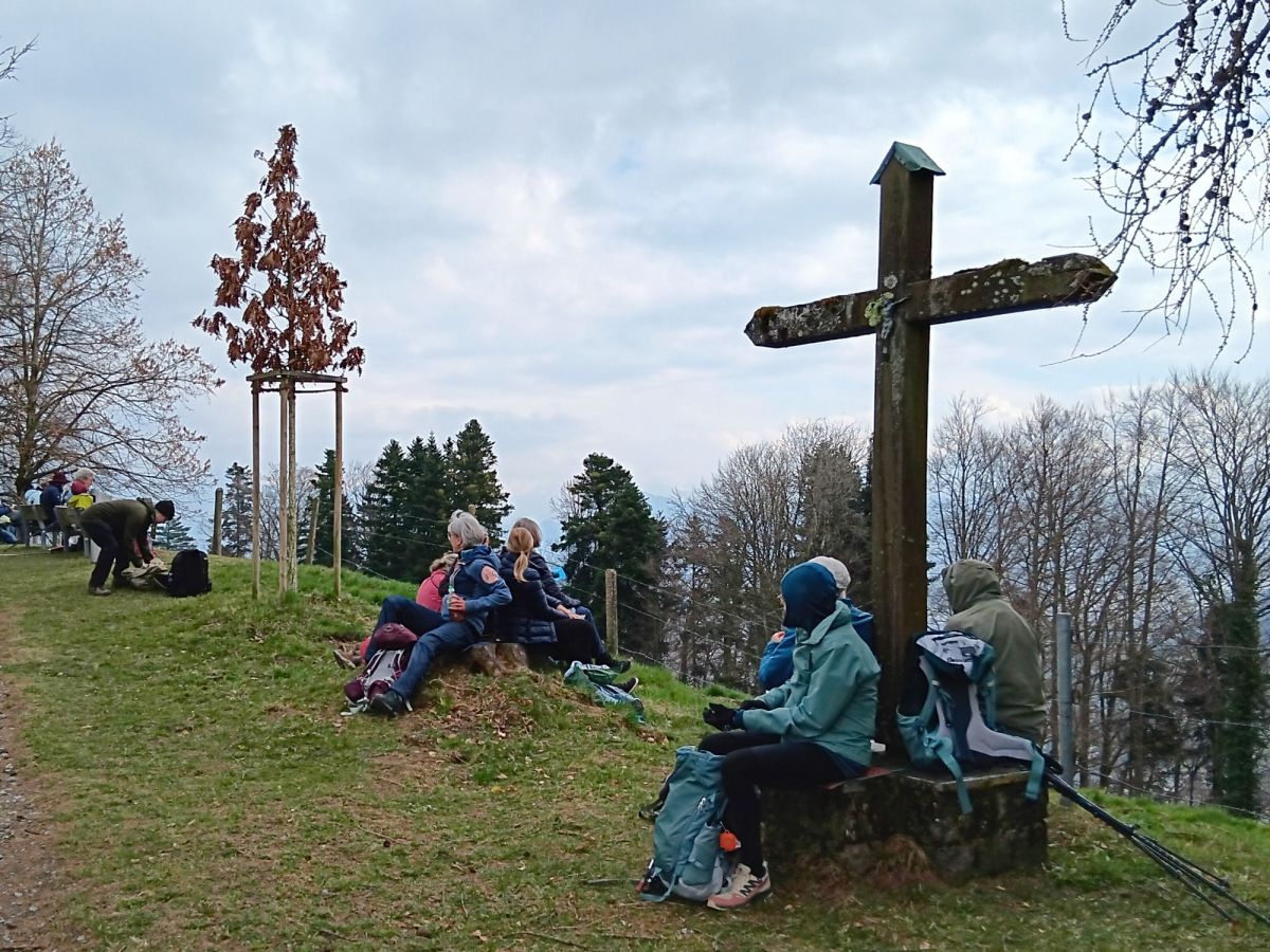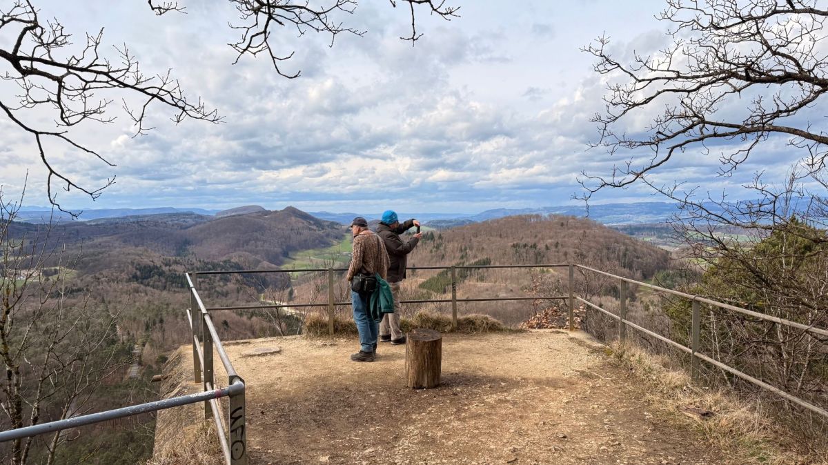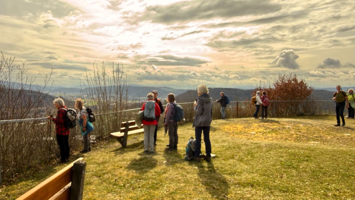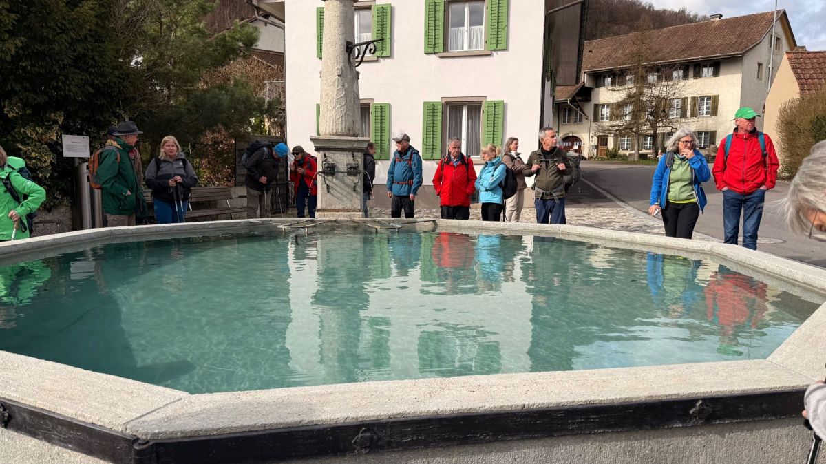 Zahlreiche, motivierte Teilnehmende haben sich zur Wanderung über den Geissberg in Villigen versammelt. Villigen nennt sich "Das Dorf der schönen Brunnen". Wir bestaunen drei, der unter Denkmalschutz stehenden Brunnen von beeindruckender Grösse. Gemeinsam mit historischen Häusern, prägen sie das schützenswerte Dorfbild. Bei frühlingshaften Bedingungen starten wir zum Aufstieg zur Burgruine Besserstein, einer ehemaligen Hochwacht und frühzeitlichen Wehranlage, sowie einer einstigen Befestigunsanlage aus den Kriegsjahren. Hier geniesst man einen Überblick über das Aaretal und leider sind die Alpen heute nur schemenhaft zu sehen. Zügig wandern wir zum Gabenkopf, wo wir einen Augenschein in den gigantischen Steinbruch der Firma Holcim nehmen, in welchem seit 1954 Kalk und Mergel abgebaut wird. Mit Wiederaufforstungs- und Schutzmassnahmen werden im Steinbruch Biotope für gefährdete Pflanzen und Tiere geschaffen. Weiter gehts es zum "Geissberg Chameren" und dem Picknickplatz. Von der Aussichtsplattform des Geissberges geniessn wir einen Überblick über den Argauer Tafeljura bis zum Schwarwald. Im stetigen Ab und Auf erreichen wir den Laubberg, den Hausberg von Gansingen. Die schlichte Kapelle lädt zu einer Rast ein. Nach dem Abstieg öffnet sich die Landschaft über das Mettauertal. Wir folgen dem Weg nach Wil AG und kehren am Schluss der Wanderung zu einem gemütlichen Umtrunk im Restaurant Hirschen ein.