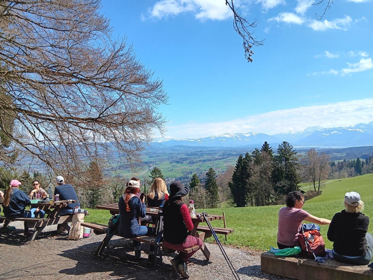 Bei frühlingshaftem Wetter traf sich eine gut gelaunte Gruppe am Bahnhof Erlenbach. Gemeinsam stiegen wir durch das Erlenbacher Tobel hinauf und wanderten über Felder und durch Wälder bis zu einem kleinen See, wo wir unsere Mittagspause einlegten.
