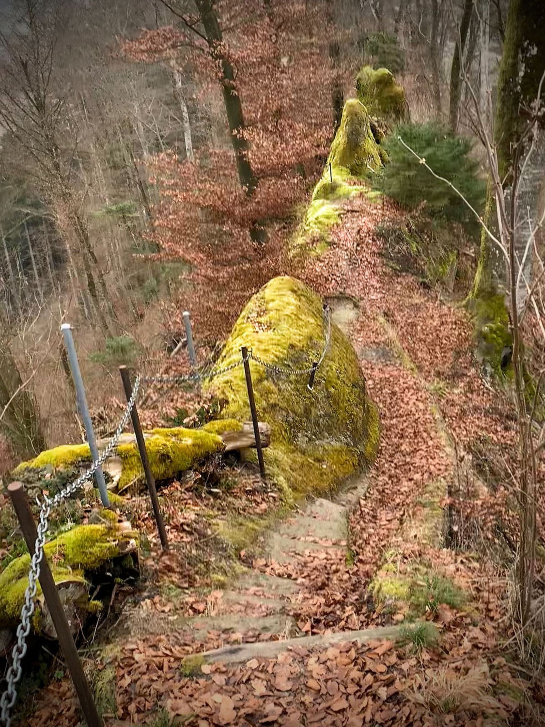 einem schmalen, bewaldeten Gratweg. Entlang steil abfallender